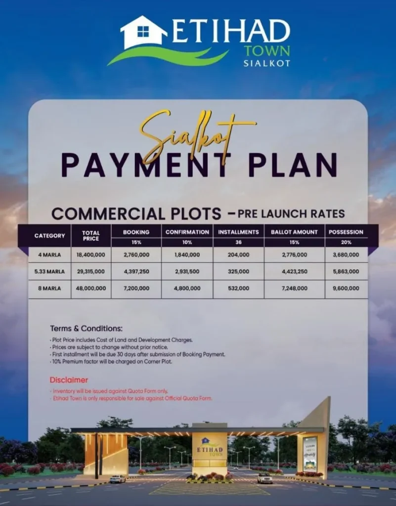 Etihad Town Sialkot Commercial Plots Payment Plan
